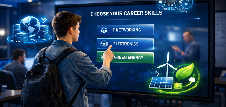 Sabse pehle candidate apni interest aur market demand ke hisaab se skill choose karta hai—jaise IT Networking, Electronics, ya Green Energy. Entry level se hi practical mindset develop kiya jata hai.